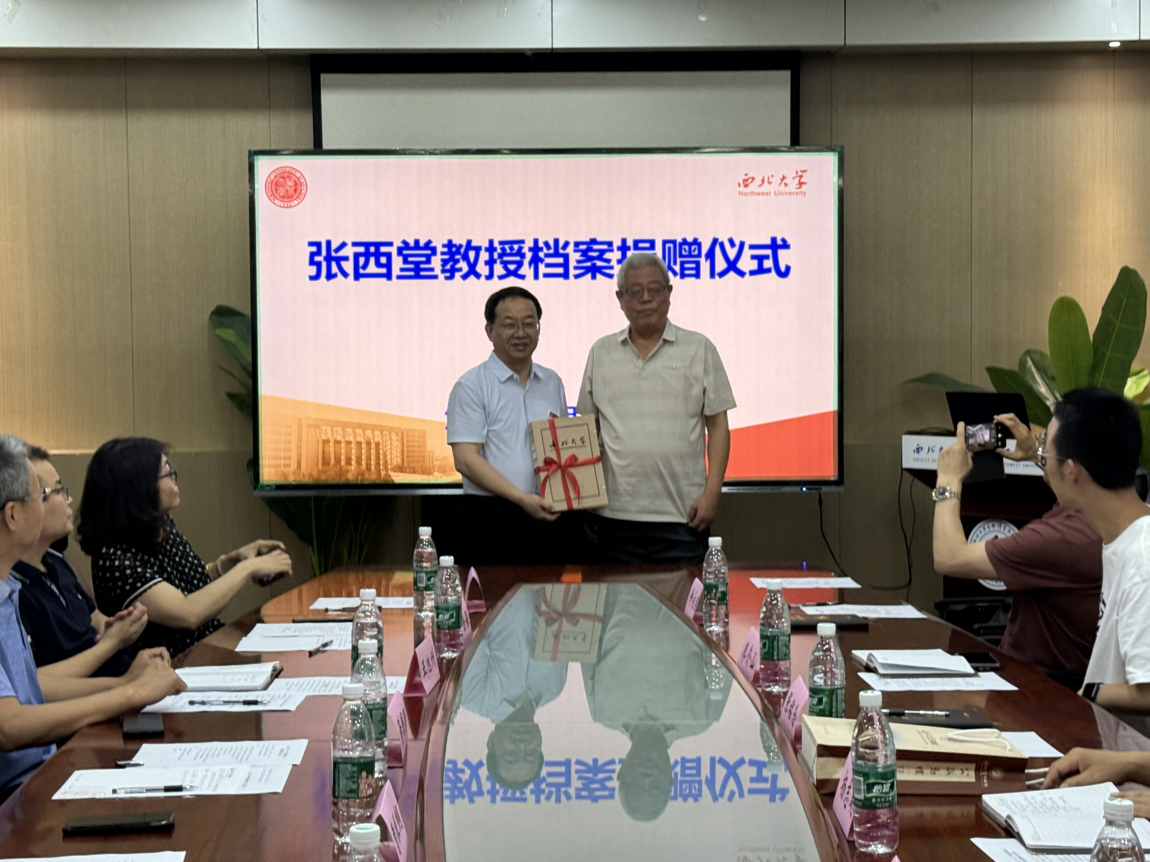 董国强代表学校接收了捐赠的档案,向张铭洽、李浩颁发了收藏证书并赠送了《西北大学大事记(2002-2022)》《西北大学学人谱 第四集(2012-2022)》《西北大学藏民国版权证图录》等。