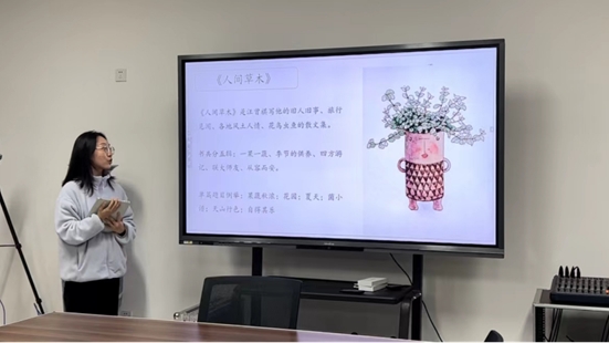 也许在某个安静的夜晚,我们回首过往,为遗憾而惋惜,我们憧憬未来,却又为未知而迷茫。刘子晴同学以汪曾祺《人间草木》一书为分享内容,把惋惜和迷茫的视角拉回当下,认为不论过去或未来,都是我们无法触及的,我们所能把握的只有当下,应寻找当下的美好。她从“高邮咸鸭蛋”一节出发,认为汪曾祺的作品质朴却蕴含生机,将我们带入一个平凡而娴静的氛围中,平常的东西在他的笔下也变得非常有趣味性。文如其人,刘子晴将汪曾祺先生品行豁朗、心性恬淡的性格引申到其文章,举例了《水果店》《夏天》和《随遇而安》几篇如同诗歌一般的文章,随风而动的平淡,不加修饰的随意,正是汪曾祺先生带给人的最大的感受。随后,她也赞美了汪曾祺被发配到“北大荒”劳动时乐观豁达的心态:珍惜当下的一点一滴、一草一木,让平凡的生活变得活泼有趣,因为只有热爱当下的生活,才能走向更好的未来。